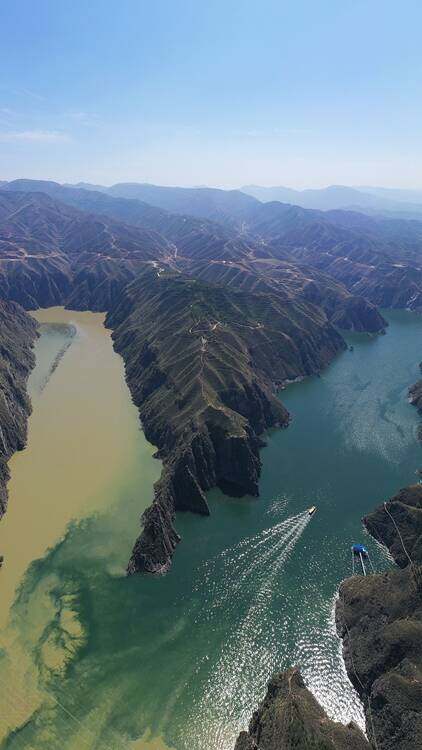 In Yongjing County, Linxia, Gansu, at the intersection of the Yellow River and Tao River in Liujiaxia Reservoir, the Yellow River is clear and the Tao River is muddy with clear boundaries. China's first million-kilowatt hydropower station-Liujiaxia Hydropower Station is here.