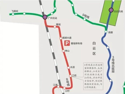 Guangzhou North Railway Station (transfer to Line 9)—Xiuquan Park—Yayao—Yayuan—Dongjing—Shenshan Dong—Shuili—Jiangfu (transfer to Line 8)—Taoyuan—Junhe—Baiyun Dalang—Xia Mao— Huangshi-Baiyun (Tangxi) Station (transfer to Line 12)-Tangjing-Yuanjing-Ziyuangang (transfer to Line 11)-Memorial Hall (transfer to Line 2 and 13). There are one Yayuan parking lot and one Tangge Depot on the whole line. It adopts 6 type A cars in the formation, with a maximum design speed of 100km/h. According to reports, the main function of Line 24 allows Huadu to quickly reach Tangxi Station and enter the city center. The station is densely located in the suburbs and sparsely located in the urban area.