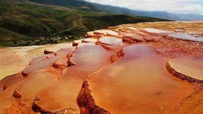 The Badab-e Surt is a series of trapedoid travertine (limestone) pools, smaller than those of the Turkish cottonburg, but in the turn-shaped valley of Telma Dare, 23 km east of the Danmar-Sali road, it is spotted with colour and quiet, isolated in a valley surrounded by mountains.