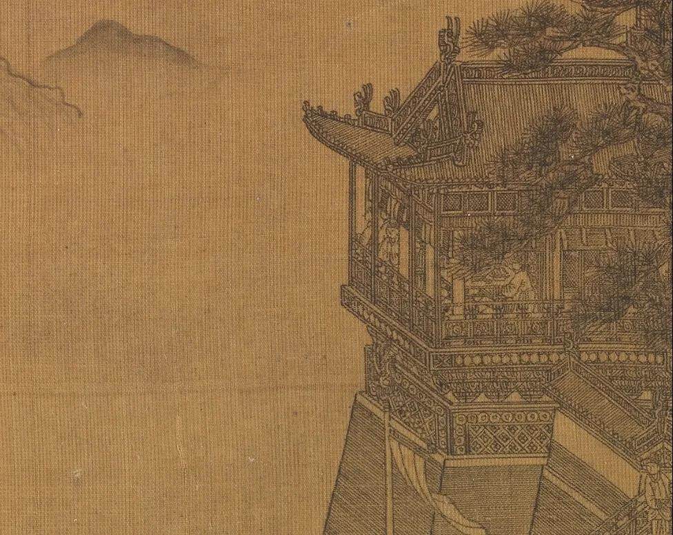 This painting is often mistaken for the Yellow Crane Tower because of the immortals who travel by crane in the picture. However, as long as you carefully identify Su Che's "Huang Lou Fu" copied in tiny tiny print on silk, it will not cause such a misunderstanding.